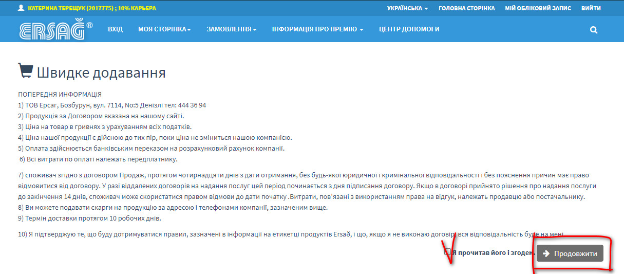 Кожен варінт починається з однакового вікна, де Вам потрібно ознайомитись та прийняти інформацію про компанію Ерсаг, про правила купівлі та користування товаром.