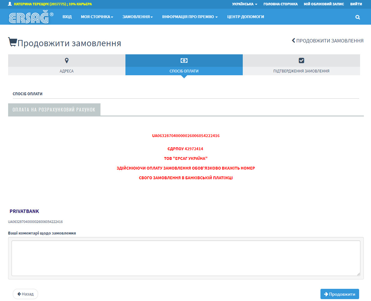 Погоджуємось зі способом оплати на розрахунковий рахунок Ерсаг, натиснувши "Продовжити"